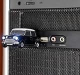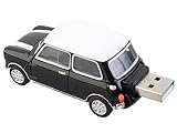 Officially licensed Mini Cooper Mk1 car USB Flash Drive in BLACK bodywork with white roof and bonnet stripes. It is for use with a desktop computer or laptop running Windows 7, 98, 98SE, ME, 2000, XP or VISTA and a Mac with OS/X 10 or later. The drive is a 1:48 scale die-cast metal model car accurate to the smallest detail including transparent windows, rotatable wheels, and illuminating headlights. The USB connector is cleverly concealed inside the boot of the car - on the base is a handle which will automatically open the car boot and slide out the USB connector. The USB drive holds 8 gigabytes of data and features front headlights which light up when the memory stick is connected to the computer. It plugs directly into any USB port of your computer which will recognize the new drive instantly for use without the need for any device drivers.